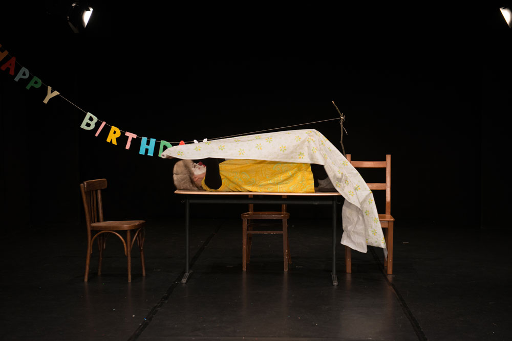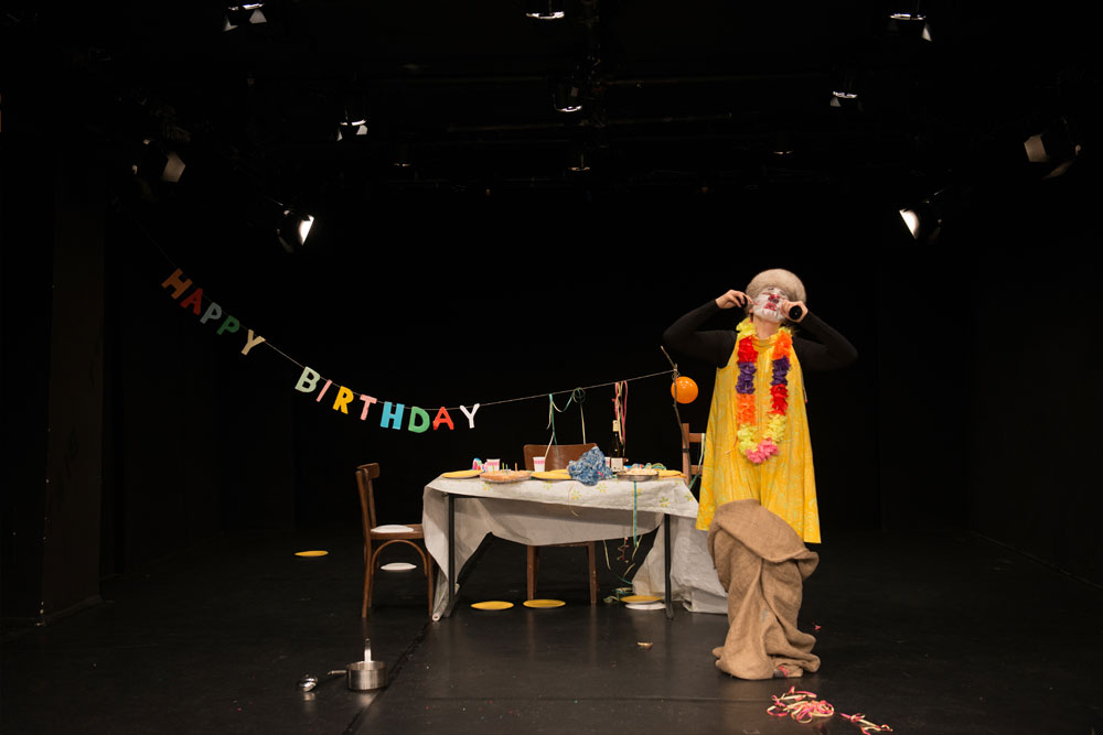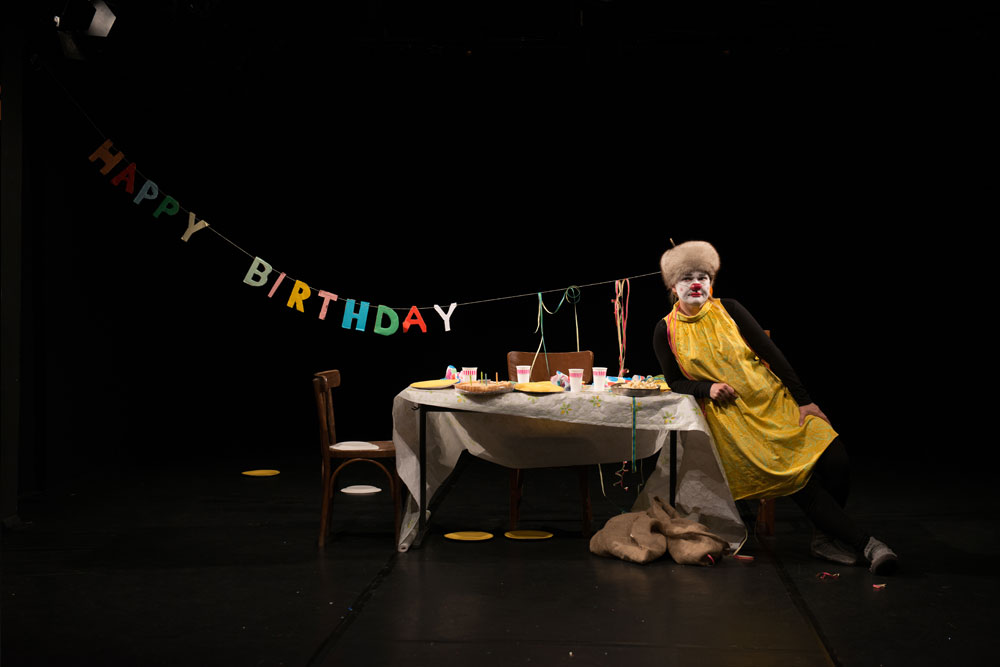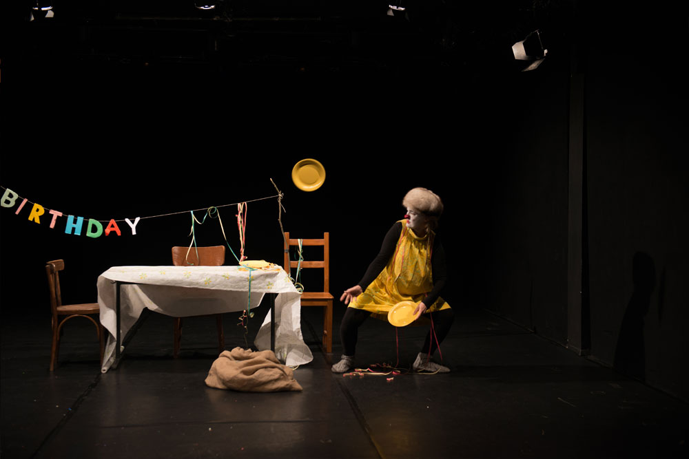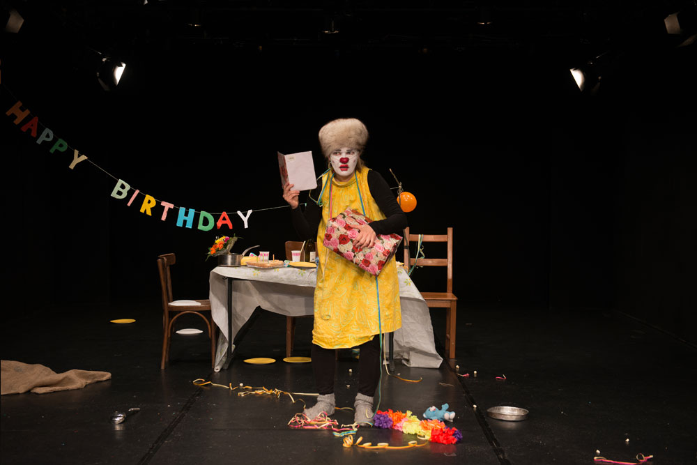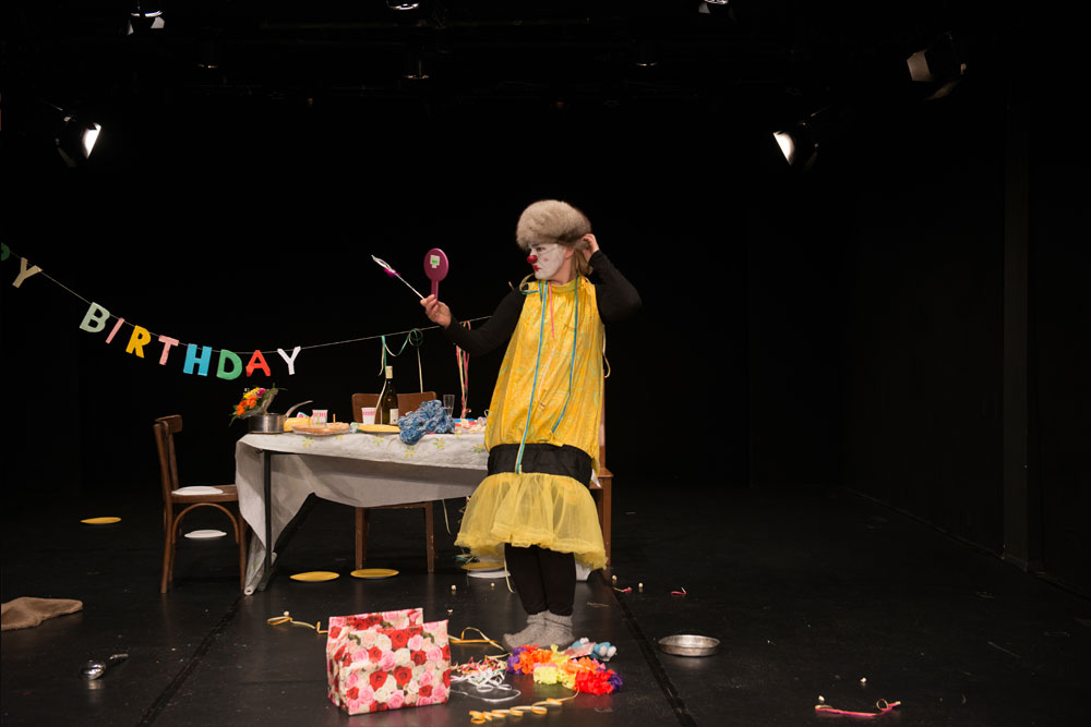 Clown Pöllänen bereitet ihr Geburtstagsfest vor. Sie wird ungeduldig und beginnt schon mal zu spielen. Mit Entschlossenheit feiert sie, ob jemand kommt oder nicht. Mal freut sie sich kindisch, weil sie den ganzen Kuchen essen darf, mal träumt sie von einem Prinz. Ein Stück über Einsamkeit und Hoffnung, erzählt mit den Mitteln vom clownesken Spiel.